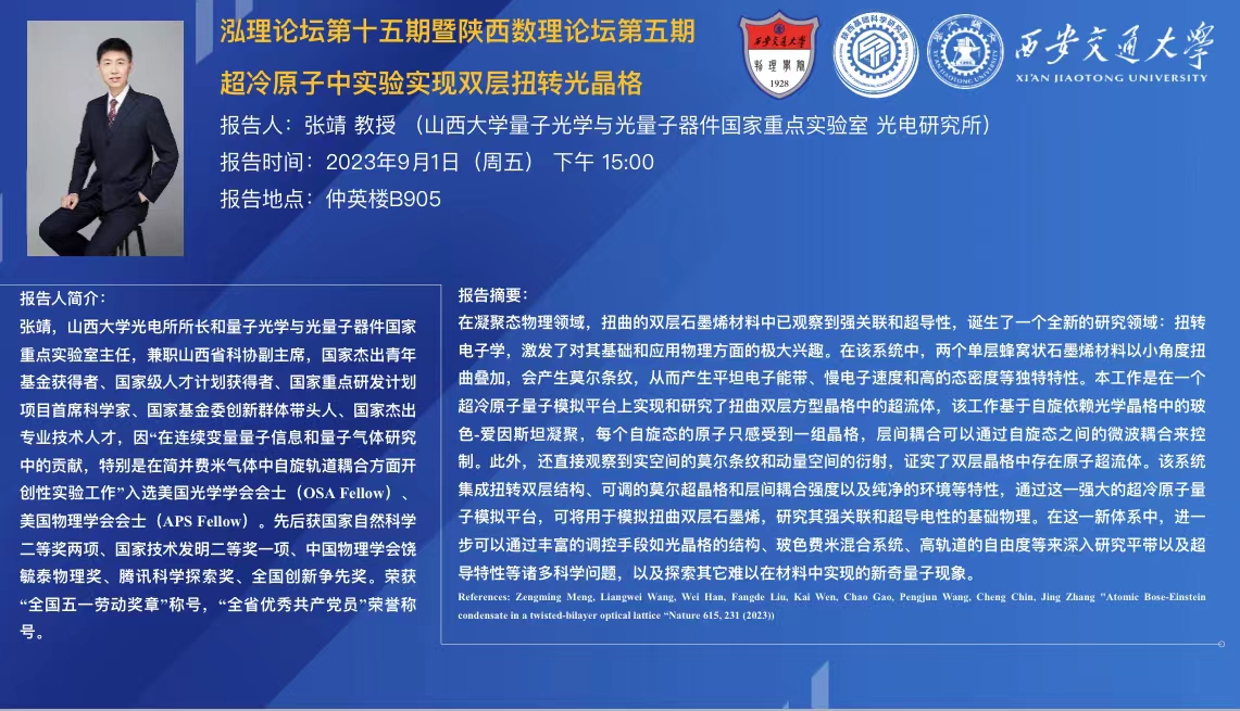 【泓理论坛第十五期暨陕西数理论坛第五期】——超冷原子中实验实现双层扭转光晶格