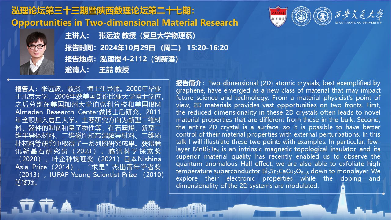 【泓理论坛第三十三期暨陕西数理论坛第二十七期】——Opportunities in Two-dimensional Material Research