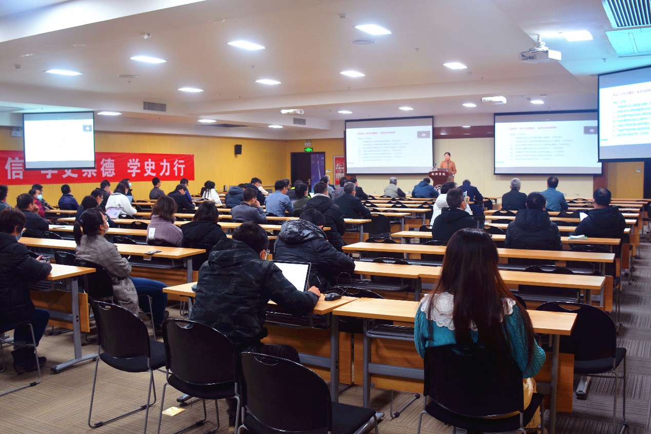 12月15日,AC米兰官方网站举办党的十九届六中全会精神宣讲报告会,邀请马克思主义学院苏玉波教授作宣讲报告。AC米兰官方网站党政领导、全体教师党员和学生党员代表参加报告会。学院分党委书记杨小渭主持会议。
