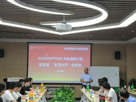 7月4日上午9点,创新港泓润楼2105会议室座无虚席,化学学院科创月——新港报告在这里拉开帷幕。本次会议的主题为:ASPDOPTOID B合成研讨会暨首届“本月分子”合成研讨会。