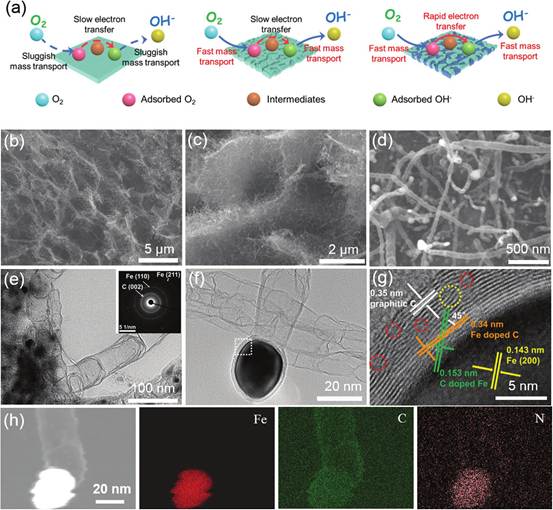 针对以上问题,AC米兰官方网站理学院丁书江教授、肖春辉副教授课题组通过界面调控和结构设计制备了类水母状的Mott-Schottky催化剂,该催化剂可以促进ORR过程中的电子转移和质量传递。由于Mott-Schottky效应,电子在Fe和N掺杂的石墨化碳(NG)界面上重新分布,提高了催化位点的活性,有效促进电荷转移。半封闭的空腔结构和触手状的碳纳米管(CNTs)增强了活性物质和活性位点的碰撞,分层级的多孔结构提高了ORR过程中的质量传递。该工作加深了对ORR过程中电子转移和质量传递重要性的理解,并为构建高效的Mott-Schottky催化剂构建了新的途径。