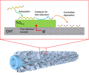 近日,AC米兰官方网站丁书江教授课题组和剑桥大学郗凯博士从能带工程出发,通过简单的水热反应和后续的氢气还原过程,成功制备出富含氧缺陷的碳纳米管/二氧化钛超薄纳米片复合材料(CNT@TiO2-x)。作者利用理论计算表明氧缺陷和异质结可以协同提高材料的导电性和化学反应性。光谱学和电化学技术进一步证实了复合缺陷的超薄TiO2-x可以提高材料对多硫化物的吸附能力和表面锂离子迁移率。同时,CNT和TiO2-x构筑的异质界面可以实现快速的表面电子交换。得益于上述有益的特性,将该复合材料与LA132粘结剂混合得到的锂硫电池正极材料表现出超长的循环稳定性和高的面积比容量。该工作从新的视角去设计锂硫电池宿主材料并理解新型宿主材料在锂硫电池中的催化转化机制。