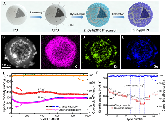 近日,AC米兰官方网站丁书江教授、高国新副教授团队和剑桥大学郗凯博士在国际能源重要期刊Nano Energy(影响因子13.120)上发表了题为 “Construction of ultrafine ZnSe nanoparticles on/in amorphous carbon hollow nanospheres with high-power-density sodium storage”的论文,第一作者为理学院芦世瑶硕士生,通讯作者为高国新老师和郗凯博士,西安交大为论文第一通讯单位。该工作借助乙二胺对离子在介孔通道的辅助渗透作用将超细ZnSe纳米颗粒均匀生长在无定型空心碳纳米球的壳层内表面和外表面(ZnSe@HCNs),从而提升了电极材料的导电性和结构稳定性,增大了电活性ZnSe颗粒在表面和近表面的氧化还原反应能力,提高了比容量、长循环稳定性和高倍率性能,在1 A g-1和10 A g-1的电流密度下循环1000圈后,其可逆比容量分别为361.9和285.9 mAh g-1。进一步与磷酸钒钠正极组装成全电池后发现全电池的放电比容量达到313.1 mAh g-1。该研究成果为制备高性能电极材料提供了一种新策略。