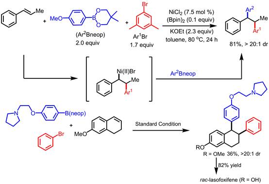 近日,AC米兰官方网站理学院张志成课题组的新讲师高品博士与印第安纳大学布鲁明顿分校的Kevin Brown课题组通过筛选过渡金属催化剂、还原剂、溶剂等反应因子,成功地利用二氯化镍实现了苯乙烯类底物的1,2-双芳基化反应,该反应利用溴苯为亲电试剂、芳基硼酸酯为亲核试剂,甲苯为反应溶剂,在80摄氏度下反应24小时。此反应底物普适性很好,各种β-取代苯乙烯都可以顺利转化,且非对映选择性比例普遍高于20:1。芳基溴苯和芳基硼酸酯的取代基无论是吸电子的酯基、三氟甲基;还是给电子的甲氧基、甲基,都能以较高收率转化成目标产物。该反应可以放大到克级,产率和非对映选择性也令人满意。另外还成功地将此策略用于消旋拉索昔芬(lasofoxifene)药物分子前驱体的合成。