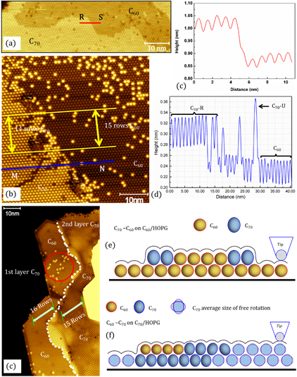 近日,AC米兰官方网站理学院陈光德课题组与英国伯明翰大学物理与天文学院NPRL的Dr. Quanmin Guo课题组合作,介绍了一种新型的定向外延生长的分子范德瓦尔斯异质结。与传统的异质结不同,这种新型异质结,组成仅为有机分子,内界面以及分子间都是以范德瓦尔斯力相互作用组装在一起,这个过程中并未引入任何氢键或者离子键。室温下,在高定向热解石墨(HOPG)表面顺序沉积C60和C70两种分子,制备出了双层范德瓦尔斯异质层。研究发现了常温下HOPG表面C70自组装分子层中C70分子全部处于自由旋转状态;当引入C60分子后,C70分子的旋转状态会受到引入的C60分子的调控,可以选择性的站立或自由旋转,并从分子层面上揭示了这种调控的机理。这个发现可以用于研究其他涉及到非球状颗粒系统,甚至胶体系统。