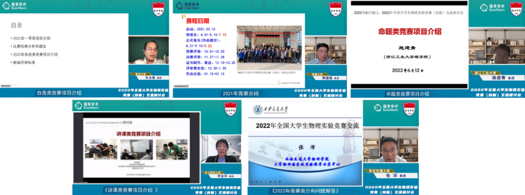 上午的会议由清华大学张留碗教授和东北大学王旗教授主持。南昌大学韩道福教授对2021年(第七届)全国大学生物理实验竞赛做了总结;浙江工业大学施建青教授对命题类竞赛项目做了详细的介绍;复旦大学乐永康教授对自选类竞赛项目做了详细的介绍;东北师范大学李金环教授对讲课类竞赛项目做了详细的介绍;我校张沛教授对2022年竞赛简介及常见问题做了介绍和解答。