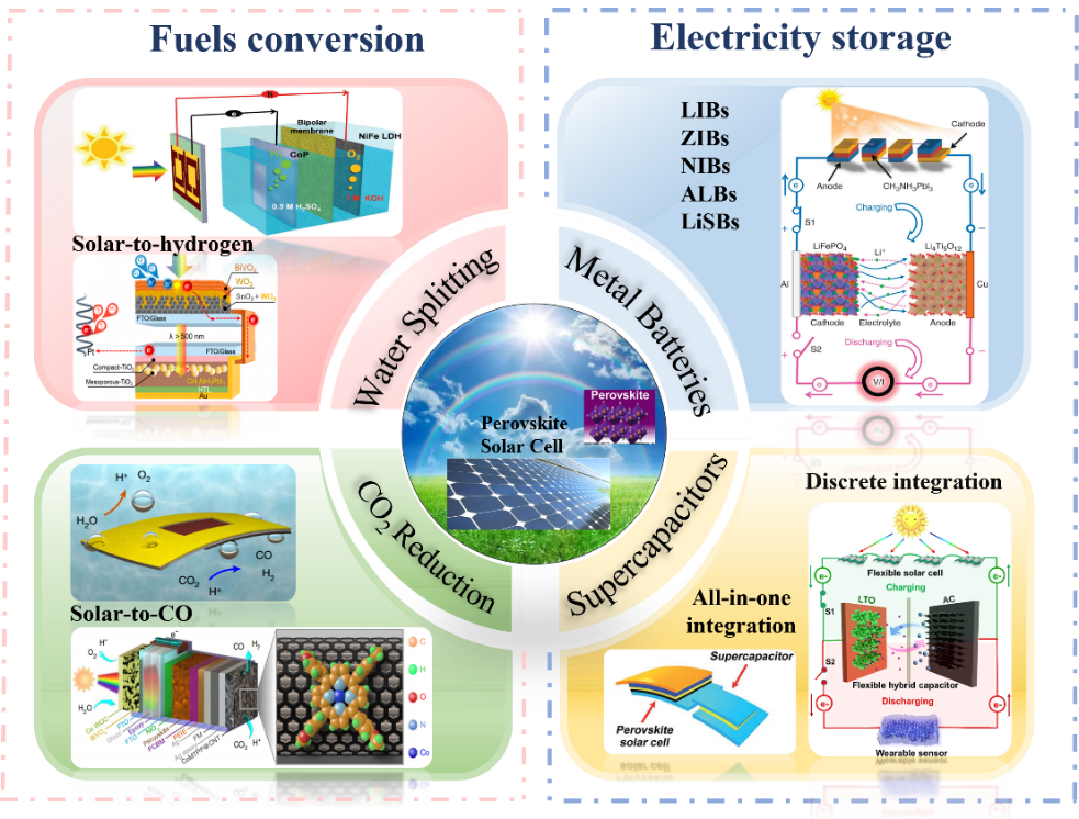 金属卤化物钙钛矿太阳能电池因其具有低成本、高效率的优势,在过去的十年中受到了广泛的关注。持续提高光电转化效率是钛矿太阳能电池发展的关键,但同时也面临着能源储存的困境,导致潜在的资源浪费。将太阳能转化为化学燃料被视为促进能源多样性和提高其利用效率有效途径。将金属卤化物钙钛矿太阳能电池与电化学转换系统进行集成,将光能的捕获、转换和存储一体化,可以显著提升光能的综合利用效率。基于此,AC米兰官方网站的梁超研究员、杨生春教授与澳门大学的邢贵川教授合作,系统总结了钙钛矿太阳能电池驱动的电化学燃料转换、电催化还原和电能存储系统的集成于发展现状。重点介绍了基于钙钛矿太阳能电池的新兴光电化学器件开发,包括自充电电池组、无辅助太阳能水裂解/CO2还原等领域的研究进展,并对该领域所面临的科学挑战进行了分析和展望。上述工作近日分别以(Perovskite Solar Cell Powered Integrated Fuel Conversion and Energy Storage Devices)和(Recent Progress in Perovskite-Based Reversible Photon–Electricity Conversion Devices)为题分别发表在国际知名期刊Advanced Materials和Advanced Functional Materials。论文第一作者为AC米兰官方网站博士生杨鸽鸽、杨文涵和澳门大学博士生顾浩,AC米兰官方网站梁超研究员、杨生春教授和澳门大学邢贵川教授为论文的共同通讯作者,AC米兰官方网站为论文第一作者和通讯作者单位。