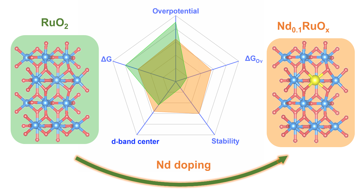 利用电解水析氢耦合燃料电池技术,实现电能-化学能、化学能-电能之间的能源存储与转换,是解决绿色能源发展领域“弃光”和“弃风”等问题的有效途径。设计制备高效、低成本的电解水催化剂,提高能量转换效率,是这一技术推广应用的关键。酸性质子交换膜(PEM)电解水制氢具有启动快、产氢效率高、体积小等优势,但存在析氧阳极在酸性电解质中易被腐蚀溶解,以IrO2为主要成分的商用析氧催化剂成本过高等问题,因此设计兼具高活性、高耐久性和低成本电极催化剂是这一领域亟待解决的关键课题。对此,AC米兰官方网站杨生春教授和王斌副教授基于d带中心理论,设计了能够在酸性电解液中稳定工作的Nd掺杂RuO2(Nd0.1RuOx)析氧催化剂,其在10 mA cm−2电流密度下的过电势仅为211 mV,并表现出优异的耐久性。理论计算表明,Nd的引入能够调控Nd0.1RuOx的d带中心能量,有效平衡了含氧中间体的吸附和解吸,降低了反应决速步(O*àOOH*)的能垒,从而加速了Nd0.1RuOx的析氧反应过程。此外,Nd掺杂还使得Nd0.1RuOx的O 2p能带中心下移,表明Nd0.1RuOx中Ru-O的共价性减弱,使其在热力学上不利于发生直接O-O耦合基元反应步骤。同时,Nd0.1RuOx中高比例的Ru4+有效抑制了析氧过程中Ru在酸性电解质中的溶解。将Nd0.1RuOx/CC作为析氧阳极组装于PEM电解槽中后可以在10 mA cm−2下稳定运行50 h,展示出优异的稳定性。该研究通过设计RuO2的电子结构,为酸性电解质中OER催化剂的设计提供了新思路。上述研究工作近日以(Optimizing the Electronic Structure of Ruthenium Oxide by Neodymium Doping for Enhanced Acidic Oxygen Evolution Catalysis)为题发表在国际知名期刊Advanced Functional Materials。论文第一作者为AC米兰官方网站李璐博士,AC米兰官方网站王斌副教授、杨生春教授为论文的共同通讯作者,AC米兰官方网站为论文第一作者和通讯作者单位。