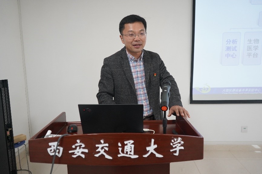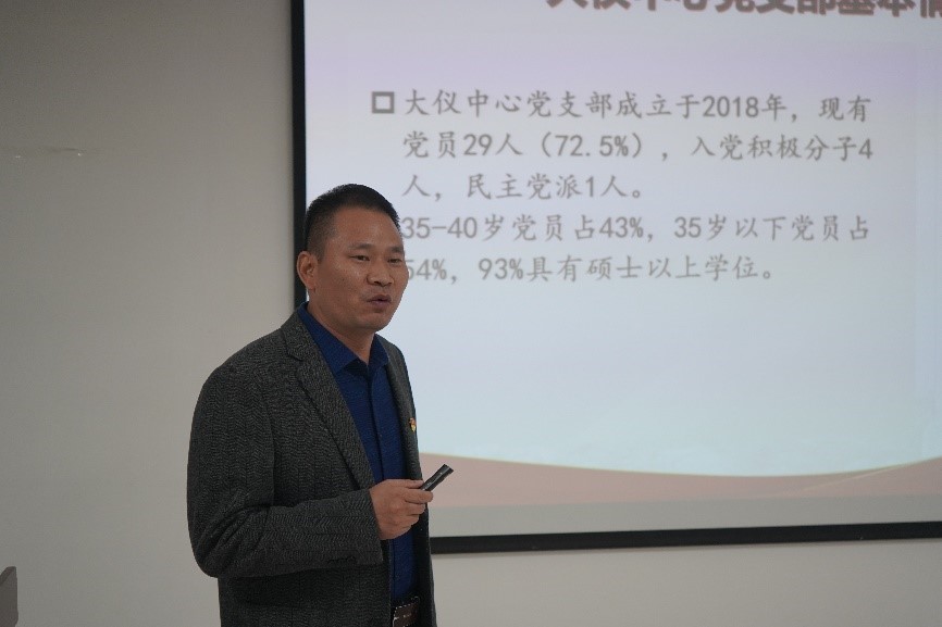 马养护从党建与业务深度融合、全力服务校内外用户、提升公共平台影响力以及推动中心高质量发展四个层面展开介绍了中心党支部建设情况。蒋臣威副主任对大仪实验中心的基本情况、分测中心主要方向、特色平台和仪器使用优惠奖励政策进行了详细的介绍。