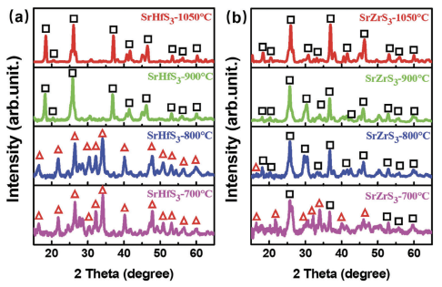 图2、不同温度硫化(a)SrHfS3和(b)SrZrS3薄膜的XRD图谱;正方形代表扭曲钙钛矿相和三角形代表针状相。