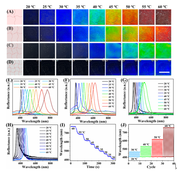 针对这一课题,AC米兰官方网站研究团队借鉴变色龙的色彩调控策略,通过将羟丙基纤维素(HPC)与聚(丙烯酸-丙烯酰胺)(P(AA-AM))水凝胶结合,成功制备了具有多色分离能力的胆淄相纤维素复合材料(CPCC)。由于复合体系中胆淄相HPC的螺距随温度升高而增大,且螺距变化范围受复合体系中水凝胶交联度的影响,因此可以通过改变水凝胶的交联度来调控HPC结构色对温度的响应行为,进而实现温度诱导下的多色分离,如图1所示。研究发现,提高HPC的浓度可以有效降低胆淄相HPC的螺距,并使得高浓度下不同交联度的CPCC在室温下的反射峰波长始终处于紫外区域,即室温下始终不显示结构色,材料呈透明状态;而随着温度升高,胆淄相HPC的螺距逐渐增大,反射峰波长逐渐红移进入可见光波段,从而表现出温度诱导的多色分离现象,如图2所示。这一发现为以温度为密匙的防伪材料的设计提供了新的思路。