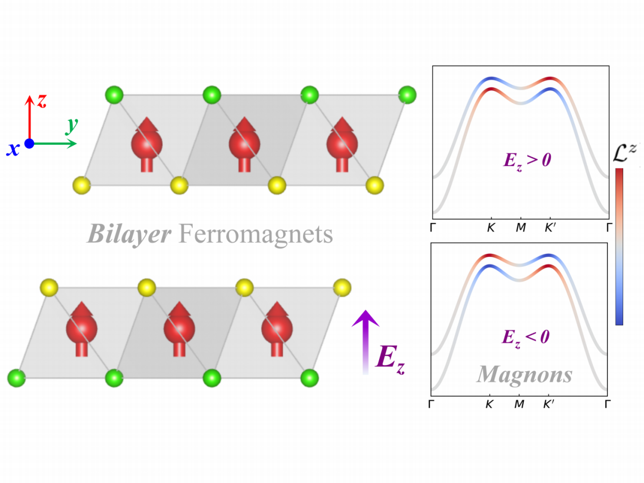 针对上述问题,AC米兰官方网站软物质与凝聚态团队姜志军特聘研究员与新加坡南洋理工大学倪斤阳博士、盐城工学院卢金炼副教授和美国阿肯色大学Laurent Bellaiche教授合作,提出了一种电场调控二维铁磁绝缘体中磁振子的通用理论框架。研究表明,在具有强自旋-层耦合的双层铁磁绝缘体中,外加电场能够有效调控层间的自旋交换相互作用,从而实现对磁振子的非易失性控制。通过密度泛函理论(DFT)计算,研究团队进一步验证了在Janus双层铬基铁磁体中,电场可精确调节两层之间的自旋交换相互作用,进而控制磁振子的拓扑性质,包括其贝里曲率和轨道磁矩。因此,相应的磁振子谷霍尔效应和轨道霍尔效应也可通过电场实现高效调控。这项工作为实现非易失自旋电子学器件迈出了重要的一步,也为未来的磁电耦合器件奠定了坚实的理论基础。
