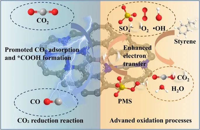 该研究实现流动相VOCs 99%的降解率(60 %的稳定矿化);电催化CO₂还原过程达到1 A cm⁻²安倍级电流密度及98%的CO法拉第效率。研究成果为推进“双碳”战略中过程降碳和末端固碳提供了重要的实验参考和理论依据,有望在未来环境能源技术中发挥关键作用。