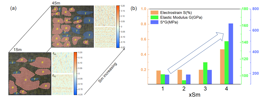 杨森教授团队提出通过稀土元素调控玻璃态准同型相界结构及其相变路径,可获得优异的机电耦合性能。该团队成功在Sm掺杂的(Bi,Na)TiO3-BaTiO3基无铅压电陶瓷中实现了压电性能的显著提升:室温对称电致应变和弹性模量分别提高了~135%和~50%(如图1所示),其优异的电致应变响应还可以在293-353K温度范围内保持。这一新策略大幅增强了材料在复杂工况下的应用效能,为高性能无铅压电材料的研发与应用提供了创新思路,尤其在精密位移驱动器和高效能量转换系统领域具有重要价值。