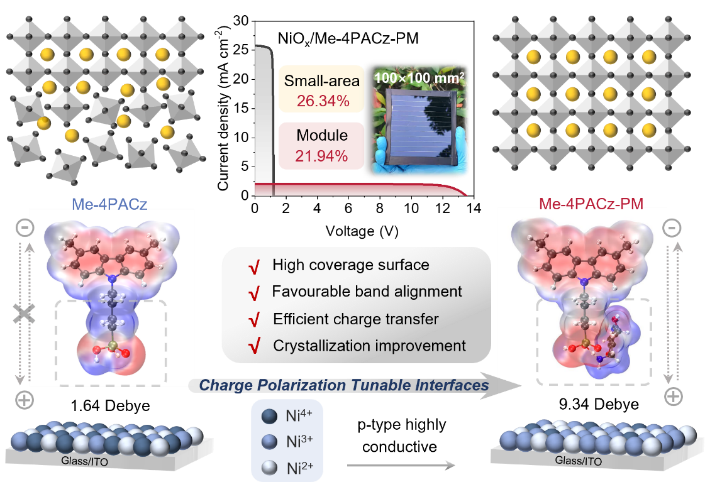 研究团队聚焦于自组装单分子膜(SAM)引发的局域电荷挑战,提出了一种创新的SAM优化策略。通过打破分子对称性,增强分子极化电荷及界面偶极,优化了电荷传输和能带排列。该策略在小面积器件和模组中分别实现了26.34%(认证25.48%)和21.94%(认证20.50%)的卓越能量转换效率,并且未封装的器件在老化1500小时(ISOS-D-1)后仍保持90%的效率。这一成果展现了界面电荷极化调控的广泛适用性,并成功推动了大面积钙钛矿太阳能电池模块的商业化应用,为未来的大规模组件生产提供了重要的指导。