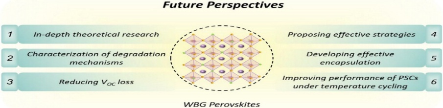 研究团队聚焦于宽带隙钙钛矿的稳定性问题,这一问题是其商业化应用的主要瓶颈。团队系统分析了宽带隙钙钛矿的降解机制,深入探讨了影响材料性能的内部因素(如离子迁移、相分离、相变等)和外部因素(如光照、湿度、温度等环境因素),并根据这些因素提出了包括成分、添加剂、界面、溶剂以及封装技术等优化策略的系统性总结。同时,研究还分析了这些优化策略在基于宽带隙钙钛矿的叠层太阳能电池中的关键应用。文章进一步展望了宽带隙钙钛矿未来发展可能面临的关键科学问题,并提出了相应的解决途径。该研究为宽带隙钙钛矿材料的未来研究和应用提供了坚实的理论基础和实践指导。
