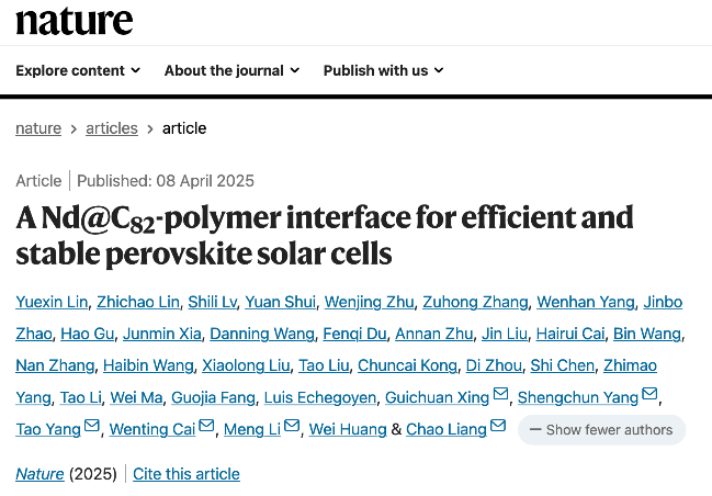 梁超研究员(杨生春和杨志懋教授团队)通过分子界面工程,首创了一种内嵌金属富勒烯分子Nd@C82与聚甲基丙烯酸甲酯(PMMA)的耦合结构,对钙钛矿层进行原位封装,有效提高了钙钛矿太阳能电池的效率与稳定性。所制备的倒置型钙钛矿光伏太阳能电池的光电转换效率(PCE)分别为26.78%(0.08cm2)(认证值为26.29%)和23.08%(16cm2,模块),在湿热测试条件(ISOS-D-3标准)下经过1000小时效率仍保持在99%以上。这一创新成果揭示了一种分子界面极化调控新机制,将为高性能钙钛矿太阳能电池设计开发提供新路径。该研究成果以“A Nd@C82-polymer interface for efficient and stable perovskite solar cells”为题于2025年4月8日在《Nature》期刊上在线发表。