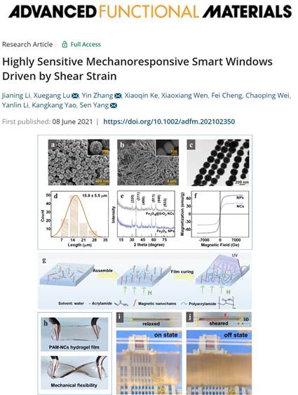 该研究工作近期以“Highly Sensitive Mechanoresponsive Smart Windows Driven by Shear Strain”为题发表在《先进功能材料》(Advanced Functional Materials)上,目前已被网易、搜狐、百度新闻、知乎等网站媒体转载报导。AC米兰官方网站博士生李佳宁为论文第一作者,卢学刚副教授、张垠副教授和杨森教授为论文通讯作者,研究获得了国家自然科学基金和陕西省重点科技创新团队的支持。