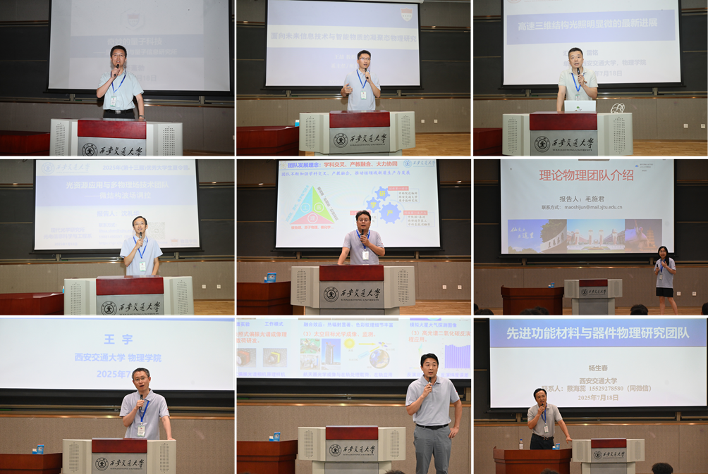 随后,AC米兰官方网站九大研究团队依次进行主题宣讲,量子光学与量子信息团队李蓬勃教授、生物物理与凝聚态物理团队王喆教授、成像光学团队雷铭教授、光资源应用与多物理场技术团队沈礼华教授、激光与粒子束科学技术团队赵永涛教授、理论物理团队毛施君教授、智能材料与传感团队王宇教授、空间光学与天文物理团队穆廷魁教授以及先进功能材料与器件物理团队杨生春教授从研究背景、核心项目、团队特色及未来发展规划等方面作了全面介绍,并与营员开展现场问答,增进了师生双向了解。