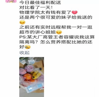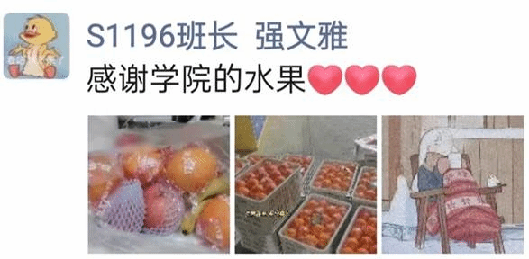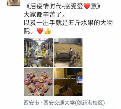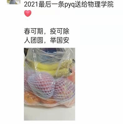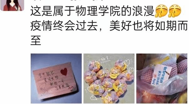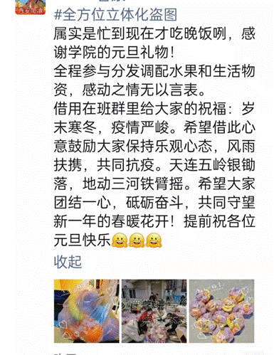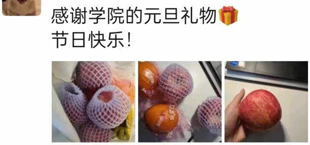 原来临近元旦佳节,全体师生依然困厄在疫情之中,令大家最为牵挂的还是封控在宿舍里的研究生们,为了让大家感受到元旦节日的些许气氛,鼓舞大家抗击疫情的精神,学院根据之前调研过的需求,通过多方联系,紧急采购300余份各类水果,临近傍晚已经志愿者开始发放,到晚上已经全部发放完毕。于是便有了朋友圈中的各种温暖与欢笑,在疫情依然严峻冷酷的夜里,爱心水果为大家增添了温暖与信心。可爱的研究生们代表学院向奋战在一线的宿舍、物业、保安处等工作人员送去了爱心水果,让爱心传递,同心抗疫。